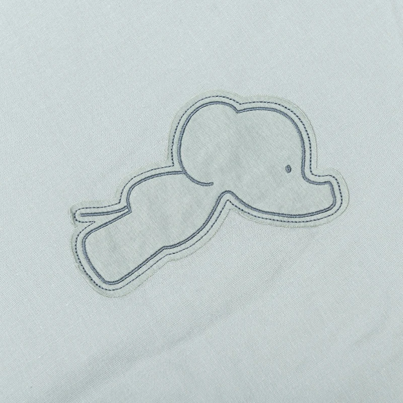 - Réversible : une face en plumetis, 1 face unie vert sauge et décorée d’un petit éléphant.