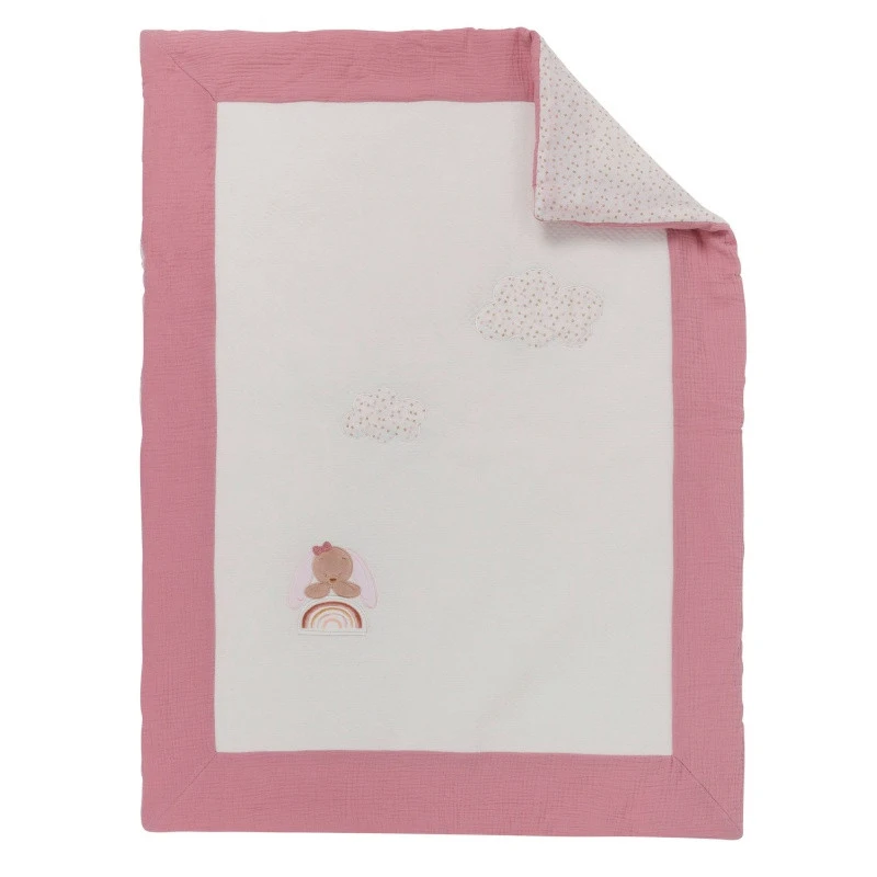 Cette adorable petite couverture rose et blanche 75x100cm assortie à la collection Sasha & Pauline par Nattou est idéale pour emporter partout, il suffit de la plier et de la ranger dans le sac à langer !