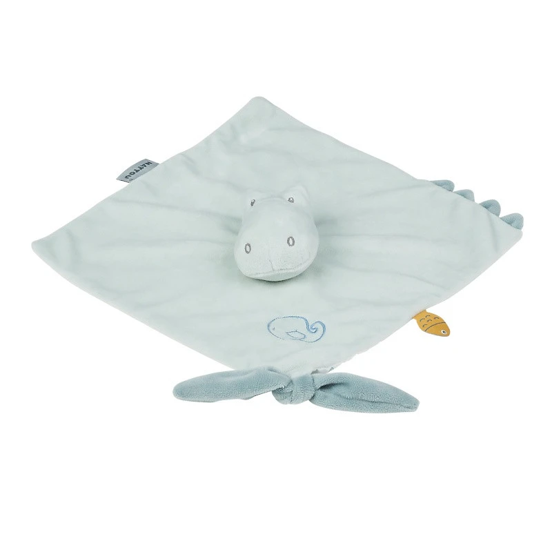 Ce charmant doudou a la forme d’un carré plat de 27 cm de côté ; il est réalisé en velours doux, dans de tendres nuances de vert, et il est décoré au centre par la tête de Roméo le croco rigolo imaginé par Nattou. Il possède sur son pourtour de fines étiquettes à caresser ou à mâchouiller pour trouver le sommeil, ainsi que des liens où il est possible d’accrocher le second objet réconfortant pour bébé : la sucette !