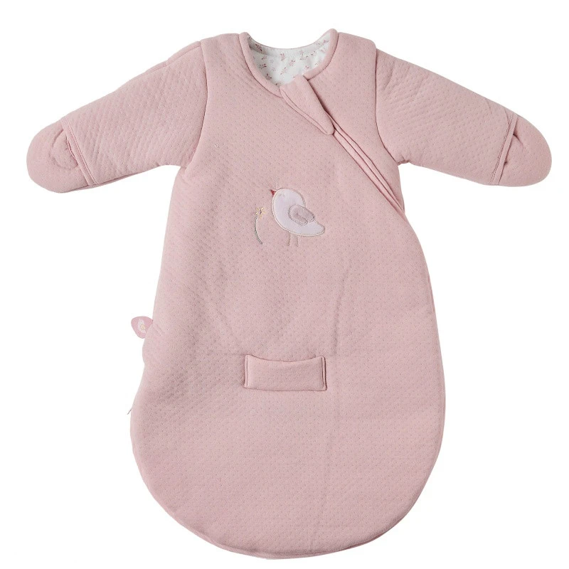 Cette jolie gigoteuse est, en effet, réalisée en jacquard doux. Elle est équipée de manches terminées par des moufles qui évitent les mains froides, et elle possède un indice de chaleur TOG 2,5, idéal pour les températures de chambre entre 16 et 19 °C.