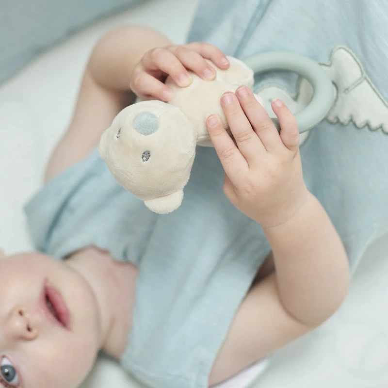 Nattou vous présente un jouet léger, conçu spécialement pour éveiller les plus petits : le hochet Jules l’ours de la collection Roméo, Jules & Sally. C’est l’association réussie d’une ravissante peluche en velours doux et d’un anneau de dentition en silicone qui soulagera les douleurs des premières poussées dentaires !