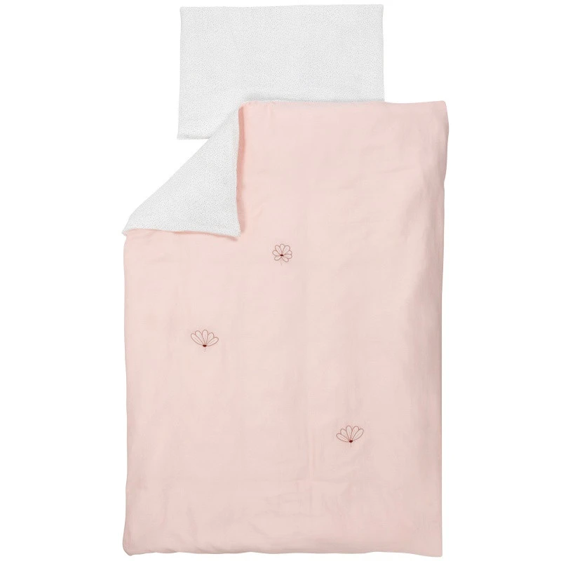 La housse de couette et taie d’oreiller Nattou Susie et Bonnie est réalisée dans un joli tissu rose pâle. Elle est parsemée de petites fleurs brodées dans les tons de rouille pour accompagner joyeusement les repos de votre bout de chou. La housse de couette et sa taie coordonnée se lavent très facilement en machine à 30°C.