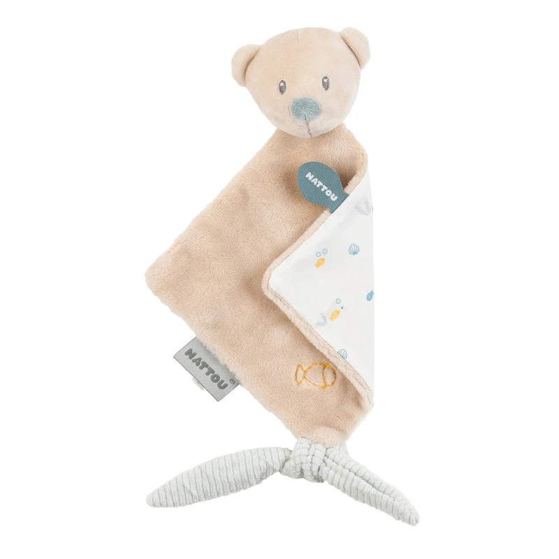 Le mini-doudou Jules a d’abord l’avantage d’être plat et souple pour être facilement pris en main par un jeune enfant. Il est embelli par la tête de l’ours beige tout mignon de la collection imaginée par Nattou, et il dispose sur son pourtour d’une curieuse étiquette en forme de poisson, ainsi que de liens où il est possible d’accrocher le second objet réconfortant pour bébé : la sucette !