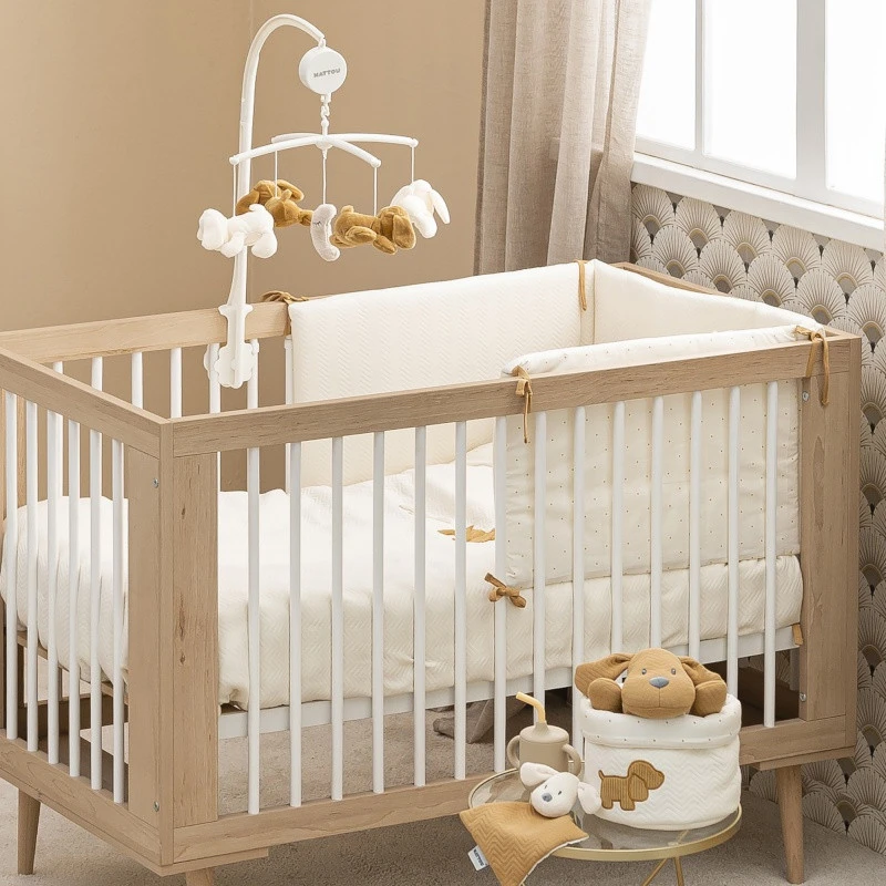 - S’accroche facilement sur la plupart des lits à barreaux ou des parcs en bois pour bébés.