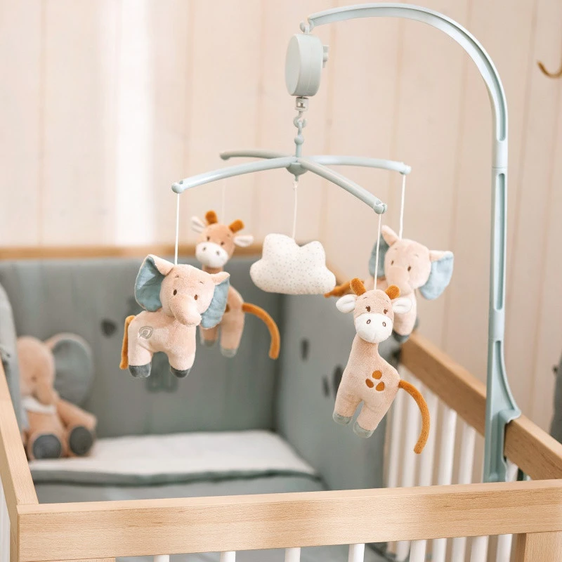 Sur son mobile musical, votre bout de chou retrouve avec plaisir les deux petits animaux imaginés par Nattou : Luna, l’adorable girafe et Axel, le charmant éléphant. Ils sont réalisés avec des tissus hyper-doux, dans de jolies teintes tendres, beige, blanc et vert sauge, ponctuées de touches plus contrastées pour mieux attirer le regard de bébé.