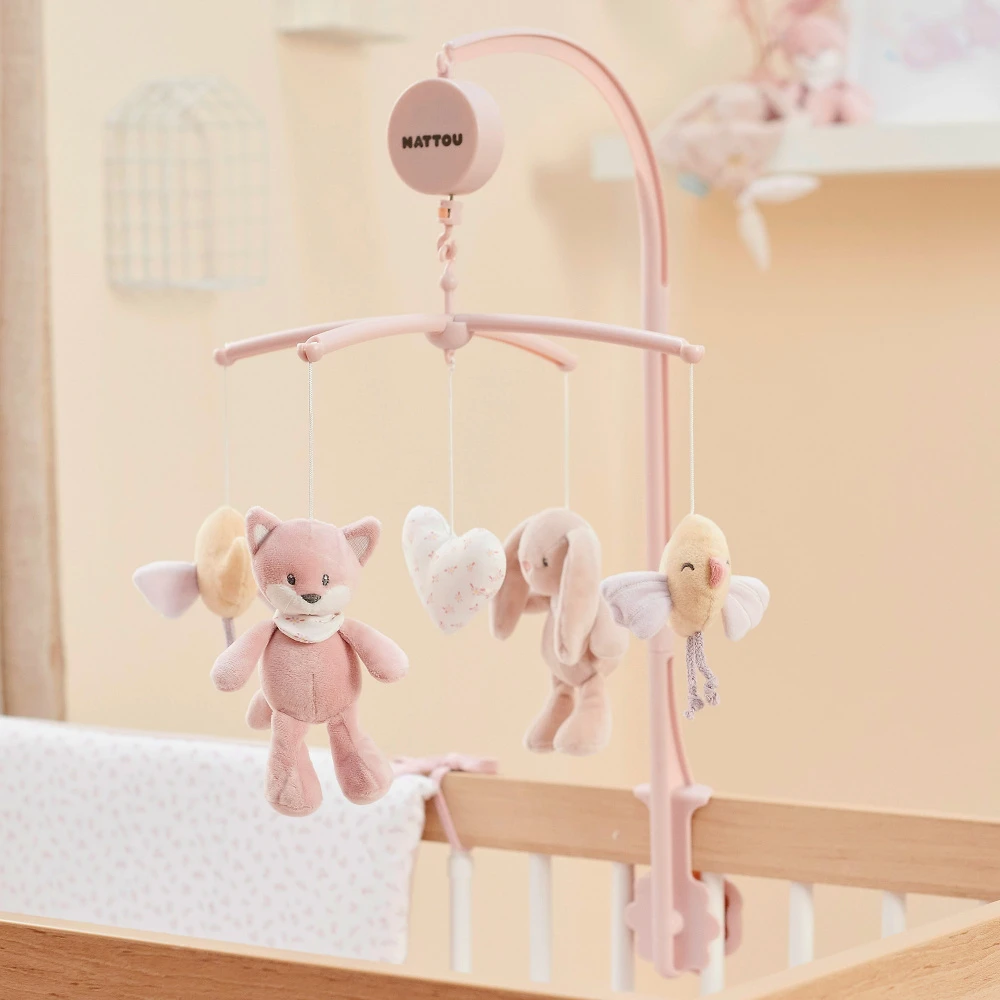 Le Mobile musical alice et pomme de chez Nattou. Le mobile est l’accessoire idéal à fixer au lit. Les petits personnages qui tournent au rythme de la chanson “La-Le-Lu” berceront bébé et l’endormiront. Les peluches peuvent être lavées en machine à 30 ° C.