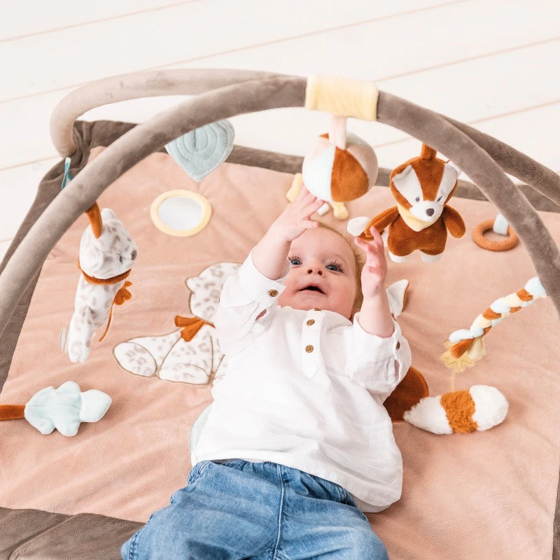 Le tapis avec arche Boris & Jungo de Nattou offre à votre tout-petit un espace confortable où s’amuser et s’éveiller ! Il peut en profiter dès son plus jeune âge : couché sur le dos ou installé dans son transat, il observe tranquillement les jouets suspendus au-dessus de sa tête, et les découvre en détail, de plus en plus nettement au fil des jours… Jusqu’à chercher à les attraper !